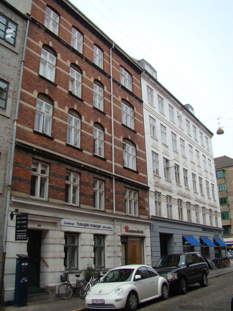 Fra 1880 stammer den fem etager høje hjørneejendom, der drives som andelsboligforening. Der er otte fag til begge gader samt et skråt hjørnefag.